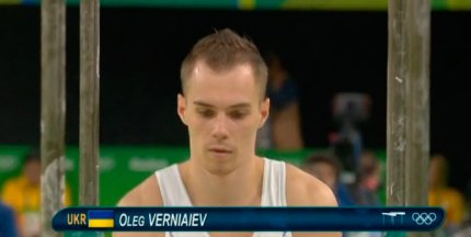 23:53. Олег Верняев выполняет упражнение на брусьях - держим кулачки