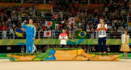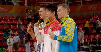 0:55. итак, японец Кохей Ушемура - двукратный олимпийский чемпион в многоборье. "Серебро" - у нашего Олега Верняева, "бронза" - у британца Макса Уитлока