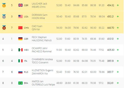 23:17. британцы Джек Лочер и Крис Миэрс стали олимпийскими чемпионами по прыжкам в воду с синхронного 3-метрового трамплина. "Серебро" - у американцев Сэма Дормана и Майка Хиксона. "Бронза" - у китайцев Жуаня Цао и Кая Квина, которые упустили победу в последнем прыжке