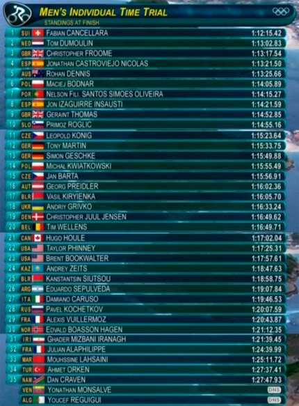 18:55. олимпийским чемпионом в велогонке с раздельным стартом стал швейцарец Фабиан Канчеллара. "Серебро" у нидерландца Тома Дюмолена, "бронза" у британца Кристофера Фрума