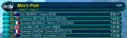 16:55. новозеландцы Эрик Маррей и Хамиш Бонд завоевали золотую медаль в заезде двоек распашных без рулевого. Вторые - южноафриканцы Лоуренс Бриттейн и Шон Килинг, третьи - итальянцы Джованни Абагнале и Марко ди Констанцо