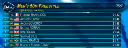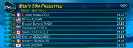 4:05. результаты первого полуфинала на дистанции 50 метров вольным стилем среди мужчин