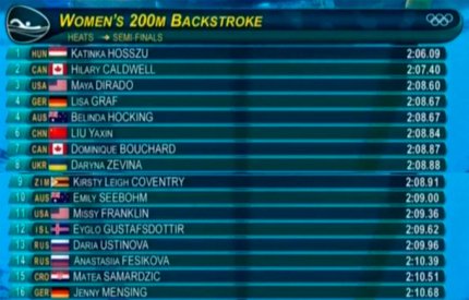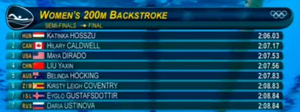 4:49. восьмерка финалисток на дистанции 200 метров на спине среди женщин. Дарье Зевиной не хватило 0.23 секунды. Жаль, ведь украинка могла быть третьей в своем полуфинале