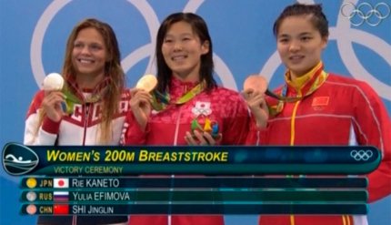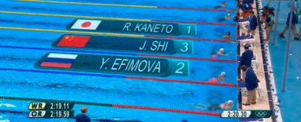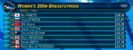 4:20. японка Риэ Кането - олимпийская чемпионка на дистанции 200 метров брассом. Вторая - россиянка Юлия Ефимова, третья - китаянка Дзинглин Ши