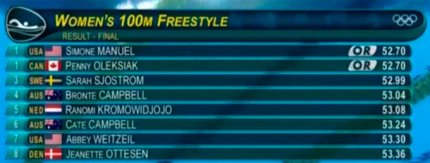 5:32. фантастика! Олимпийскими чемпионками в финале на 100 метров вольным стилем стали канадка Олексяк и американка Мануэль, выигравшие заплыв с новым олимпийским рекордом. "Бронза" у шведки Сьострем