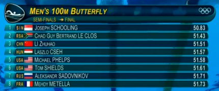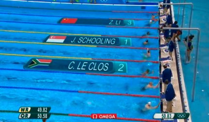5:56. второй полуфинал на 100-метровке баттерфляем уверенно выиграл сингапурец Шулинг