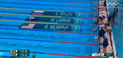 4:30. олимпийским чемпионом на дистанции 200 метров на спине стал американец Мэрфи. Серебряный призер - австралиец Ларкин, а "бронзу" завоевал россиянин Рылов