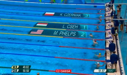 5:50. Фелпс первые 50 метров шел последним, но на второй части заплыва наверстал и финишировал вторым. А выиграл заплыв венгр Чех