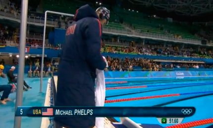 5:45. в этот раз Фелпс не подошел к жене и сыночку, поскольку через несколько минут Майкл стартует на дистанции 100 метров баттерфляем