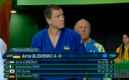 18:46. урааааааааааа!!!!!!!!! Артем Блошенко вышел в полуфинал олимпийского турнира по дзюдо в весовой категории до 100 кг. В четвертьфинале украинец уверенно победил немца Карла-Ричарда Фрая. В середине боя Артем сделал прийом на оценку иппон, но судьи дали только ваза-ари. А затем Артем сделал еще один прийом - юко