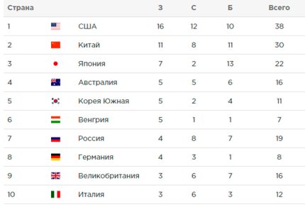 6:47. в медальном зачете США серьезно оторвались от китайцев. А в борьбе за третье место лидируют японцы