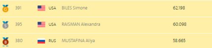 00:20. гимнастки разыграли медали в индивидуальном многоборье. Олимпийской чемпионкой стала Симона Байлс из США, серебряный призер - еще одна американка Александра Райсман. Третья - россиянка Алийя Мустафаева