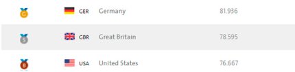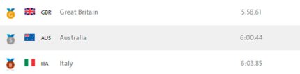 19:00. в заезде распашных четверок "золото" завоевал британский экипаж. Вторыми финишировали австралийцы. А "бронза" у итальянцев