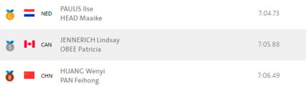 18:40. олимпийскими чемпионками в заезде парных двоек в легком весе стали нидерландки Ильзи Паулис и Маайке Хид. "Серебро" у канадок Линдси Дженнерих и Патрисии Оби, "бронза" у китаянок Вений Хуань, и Фейхонь Пан