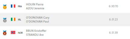 18:48. французы Пьер Хуэн и Жереми Азу завоевали олимпийское "золото" в заезде парных двоек с легким весом. "Серебро" у братьев О'Донован из Ирландии, "бронза" - у норвежцев Кристоффера Бруна и Аре Страндли