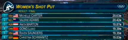 5:26. олимпийской чемпионкой по толканию ядра стала американка Мишель Картер. Серебряная призерка - Валери Адамс из Новой Зеландии. "Бронза" - у венгерки Аниты Мартон