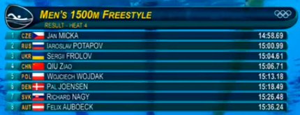 20:54. результаты заплыва на 1500 метров с участием Сергея Фролова. У украинца пока четвертый результат среди участников всех завершившихся полуфиналов. Но впереди два заплыва фаворитов. В шестом будет плыть наш Сергей Романчук