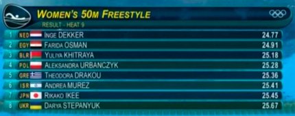 19:40. список полуфиналисток на дистанции 50 метров вольным стилем. Украинская пловчиха Дарья Степанюк заняла итоговое 42-е место. Ее результат - напомним, 25.67 с
