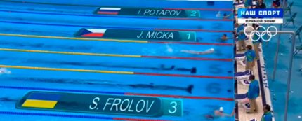 20:42. пловец Сергей Фролов преодолел 500 метров дистанции. Пока украинец третий, но плывет корпус в корпус с поляком и чехом
