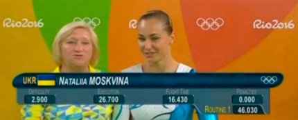 20:27. наша батутчица Наталья Москвина выполнила первый прыжок, который судьи оценили 46.030 баллами. У украинки пока пятое место, но будет еще один прыжок