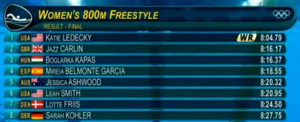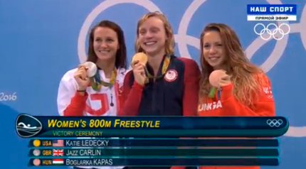 5:14. подиум заплыва на 800 метров среди женщин. Ледеки - 4-кратная чемпионка Рио