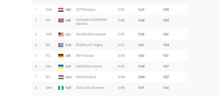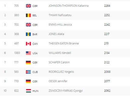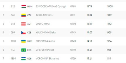 16:38. наши семиборки Анна Касьянова и Алина Федорова после первого этапа (бег на 100 метров с барьерами) занимают 17-е и 28-е места соответственно. У Анны 1027 очков, а у Алины 964 очка