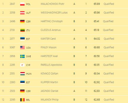 18:11. закончилась квалификация в секции для метания диска. В финал вышли 12 из 35-ти атлетов. Результаты украинцев: 23. Никита Нестеренко- 60.31 м, 32. Алексей Семенов- 55.35 м
