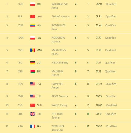 17:52. завершилась квалификация в толкании ядра среди женщин. В финал вышли 12 атлеток из 36-ти. Результат украинок: 27. Ольга Голодна- 16.83 м, 34. Галина Облещук- 15.25 м