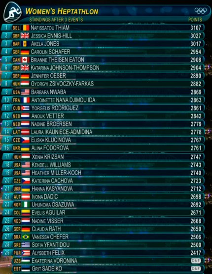 4:44. семиборье: после четырех этапов лидирует британка Джессика Эннис-Хилл - 4057 очков, 2. Нафиссату Тиам (Бельгия) - 3985; 3. Акела Джоунс (Барбадос) - 3964;.. 18. Анна Касьянова- 3636; 25. Алина Федорова- 3608.