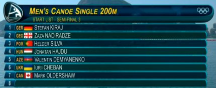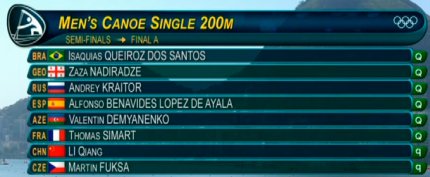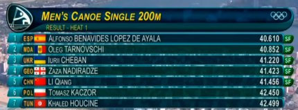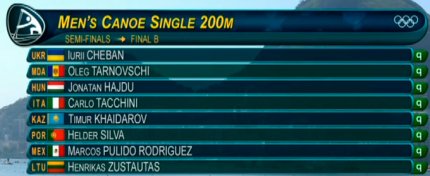 17:15. парадоксальная ситуация по итогам полуфинала в гребле на каноэ на 200 метров. Наш Чебан занял одно из двух лучших третьих мест и должен был выйти в финал, но стоит на финал В. Сейчас идут разбирательства