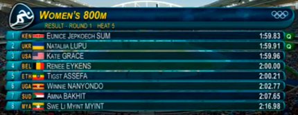 17:31. Наталья Лупу занимает 2-е место в своем забеге на 800 метров и выходит в полуфинал