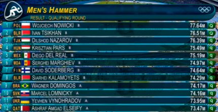 18:15. финалисты в метании молота. Среди 12-ти атлетов и украинец Евгений Виноградов, который квалифицировался в финал с 11-м результатом
