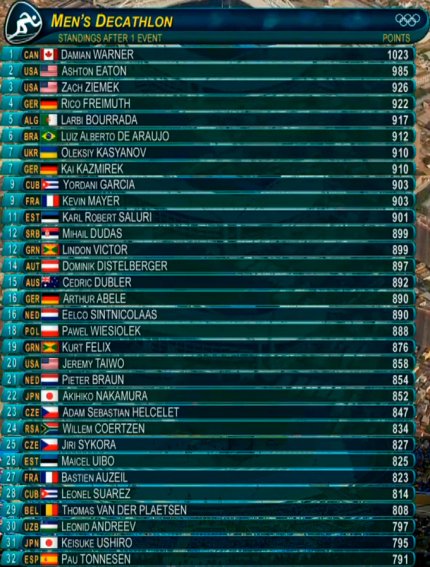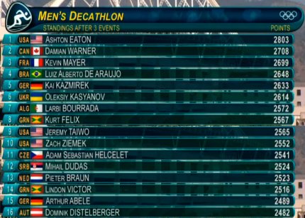 17:43. положение в десятиборье после прыжков в высоту. Алексей Касьянов - седьмой. А впереди у десятиборцев толкание ядра