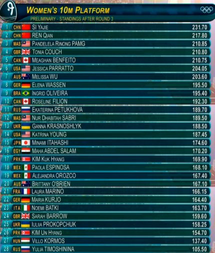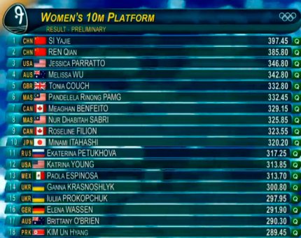 21:46. стартовала квалификация по прыжкам в воду из 10-метровой вышки среди женщин. Наша Юлия Прокопчук получила за первый прыжок 72.00 балла