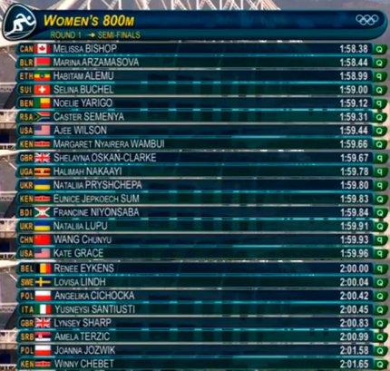17:57. итоговый список полуфиналисток в беге на 800 метров среди женщин. Наталья Прищеп а квалифицировалась с 13-м временем, а Наталья Лупу- с 16-м
