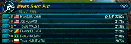 3:35. олимпийским чемпионом по толканию ядра стал американец Раян Кроузер с результатом 22.52 м - это новый олимпийский рекорд. "Серебро" у соотечественника чемпиона Джо Ковача (21.78 м). "Бронзу" завоевал новозеландец Томас Уолш (21.36 м)
