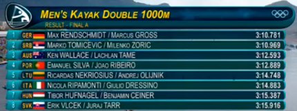 15:15. официальные результаты заезда на 1000 метров среди мужских байдарок-двоек