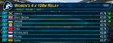 1:02. состоялась перебежка женской сборной США в эстафете 4х100 метров. Американки пробежали дистанцию за 41.77 и выходят в финал с первым результатом. Китаянки, которые были восьмыми, остаются ни с чем. Напомним, сборной США разрешили перебежку после того, как американки подали протест, указав, что их спортсменке помешала соперница