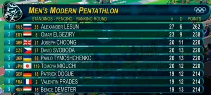 22:57. завершился раунд посева в фехтовании среди пятиборцев. Павел Тимошенко выиграл 21 поединок при 14 поражениях (все бои до 1 укола), а Андрей Федечко выиграл 16 поединков, проиграв 19