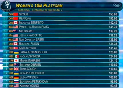 23:25. китаянки сделали золотой дубль в прыжках в воду с 10-метровой вышки. Победила Квиань Рен, а вторая Ядзе Си. Третье место у канадки Меган Бенфейто. Украинки Юлия Прокопчук и Анна Красношлык остановились в полуфинале