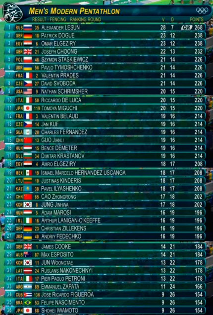 23:00. завершился раунд посева у пятиборцев. Павел Тимошенко- 6-й, а Андрей Федечко- 27-й. Завтра пятиборцы отдыхают, а в субботу будут бороться за медали