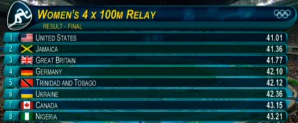 5:11. уточнение. "Бронзу" в мужской эстафете завоевала Канада (37.64 с), поскольку сборная США дисквалифицировали