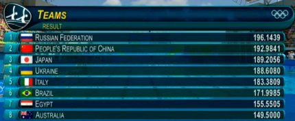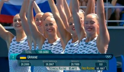 18:48. выступление наших синхронниц судьи оценили на 95.1667 баллов. Украинки вторые. Но еще не выступали китаянки и японки