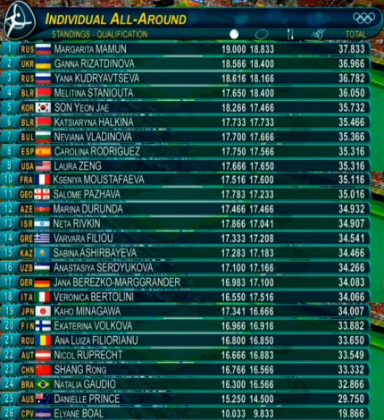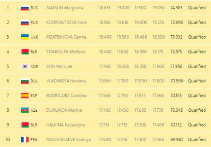 18:00. после первого этапа гимнастка Анна Ризатдинова делит второе место с белоруской Мелитиной Станютой