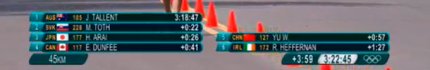 17:54. 12 спортсменов дисквалифицированы, 17 не дошли до финиша. Для многих финиш - это уже победа. Так, француз Йохан Диниз, который долгое время шел первым, несколько раз терял сознание по ходу гонки, но таки дошел до финиша, заняв восьмое место