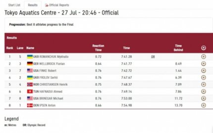 27 июля официально стало известно, что украинский пловец Михаил Романчук установил олимпийский рекорд на дистанции 800 метров вольным стилем.