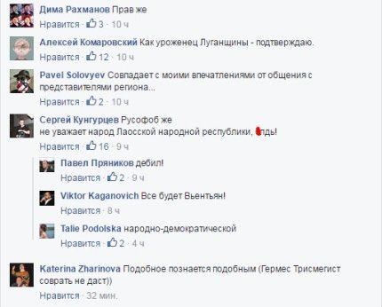 В соцсетях смеются над рассказом офицера РФ. Так, луганский блогер Савелий Вассерман иронично написал: "Какой нож в спину нашего луганского патриотизма и идей "Новороссии", "русского мира" и укропского беспредела. Что говорит этот пен*оский прихвостень из России?! Кто его купил? Обама? Да за кого он нас принимает, как он смеет обзывать наши сплоченные легионы шахтеров и трактористов, которые отстояли нашу свободу перед угрозой фашистской укропской оккупации?".