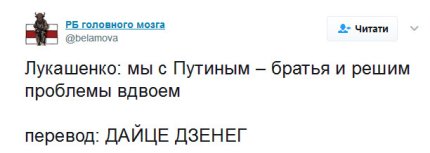 "Лукашенко: мы с Путиным – братья и решим проблемы вдвоем перевод: ДАЙЦЕ ДЗЕНЕГ (дайте денег - бел. ред.)", - написал в Twitter блогер под ником РБ Головного мозга.