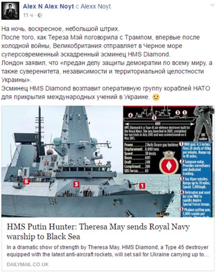Великобритания по решению премьера страны Терезы Мэй отправляет в Черное море один из самых современных своих кораблей — эсминец HMS Diamond, оснащённый противовоздушными ракетами Sea Viper.