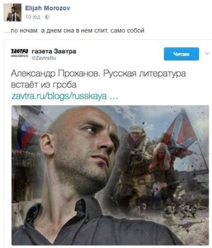 Отметим, что пользователи сети посмеялись над словами Проханова. Так, пользователь Elijah Morozov написал в Facebook: "....по ночам. а днем она в нем спит, само собой".